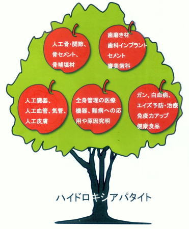 ハイドロキシアパタイトは、地球上に存在する物質の中で、水に次いで応用範囲が広い物質であろうと青木秀希博士は著しています。 人工骨、人工臓器などの医療機器から、抗がん剤などの医薬品、歯磨きなどの医薬部外品、石鹸、ファンデーションなどの化粧品、 食品、健康食品、ガスセンサー、バイオセンサー、蛍光体、吸着剤、肥料、触媒などの工業材料、消臭剤などの雑貨、宝石など数えきれません。